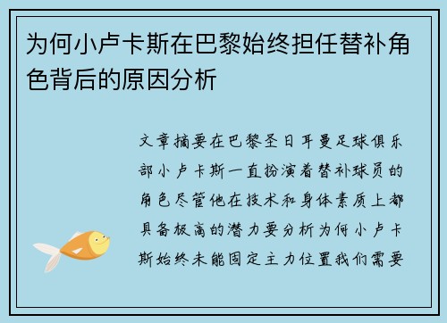 文章摘要:在巴黎圣日耳曼足球俱乐部,小卢卡斯一直扮演着替补球员的角色,尽管他在技术和身体素质上都具备极高的潜力。要分析为何小卢卡斯始终未能固定主力位置,我们需要从多个方面进行探讨。首先是战术体系的影响...